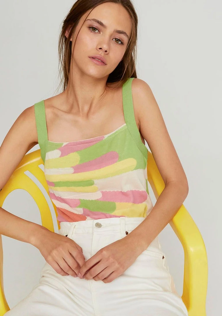 This vibrant spaghetti strap top is a versatile wardrobe wonder. It has a flattering neckline and an easy, relaxed fit. Crafted from soft bamboo mix knit, this style is sure to keep you feeling breezy all day.