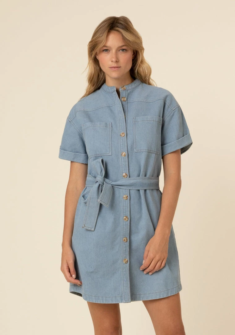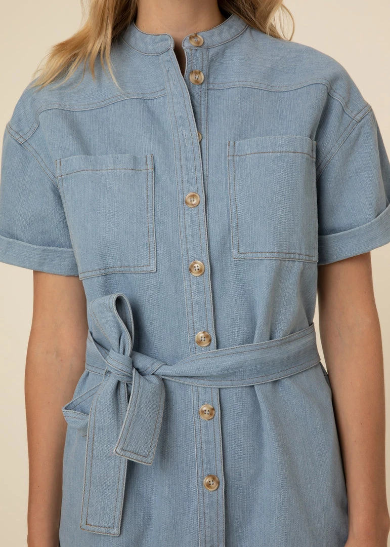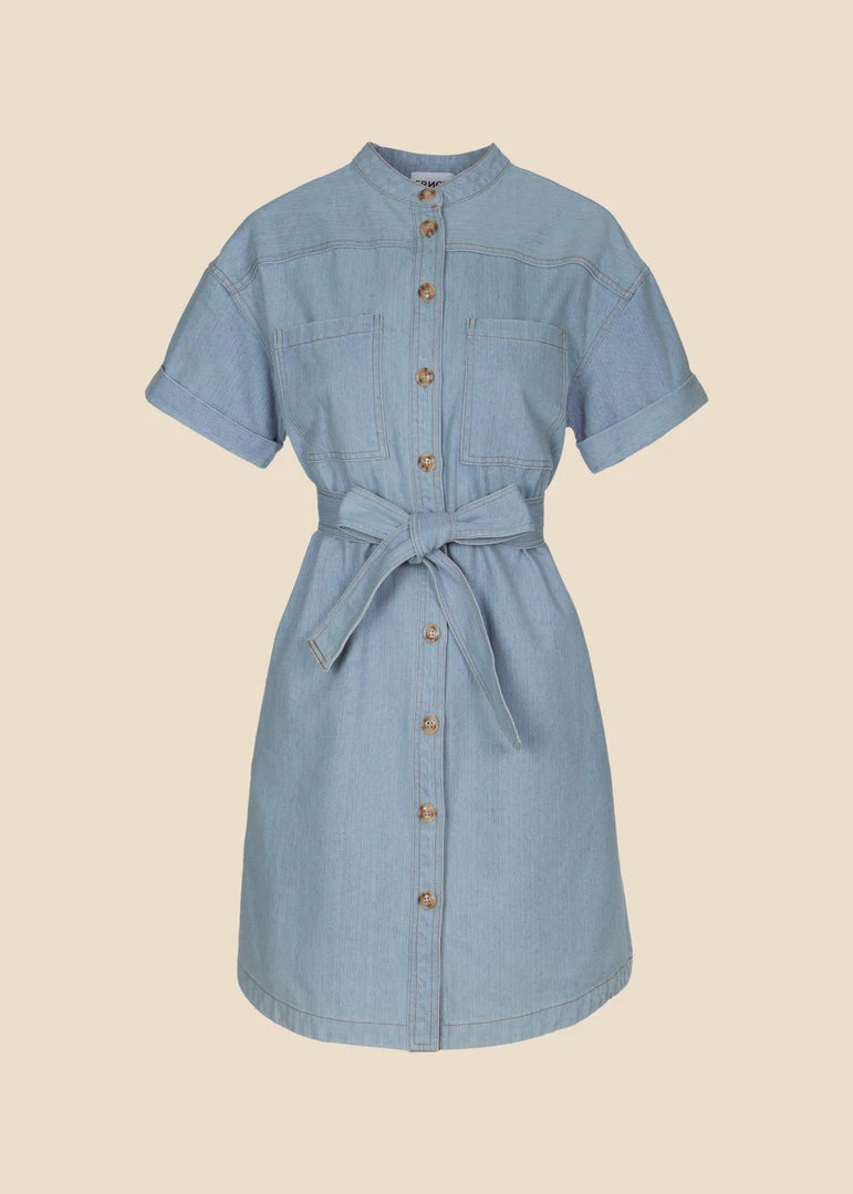 Crafted from 100% cotton, with a Mandarin Collar the perfect sun-drenched-summer option. The waist-defining tie belt and straight, above-the-knee skirt make it extra flattering. The stitch detailing at the neckline and shoulders for shaping and slipped practical pockets in at the hips. Curved hemline and rolled sleeves ensure this is an all-round everyday style.