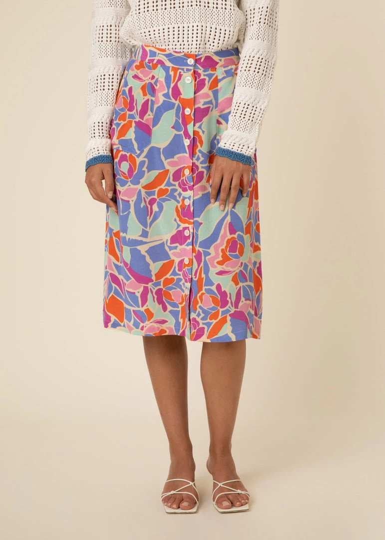 There’s plenty of style going on in this midi skirt. And it’s down to the comfortable viscose fabric and utility detailing. Top-stitched panels and horn buttons give it a smart-casual touch. Its A-line cut is semi-fitted, with cleverly positioned darts for a mega flattering fit. You’ll find useful patch pockets at the hips making this skirt burst with high summer energy.