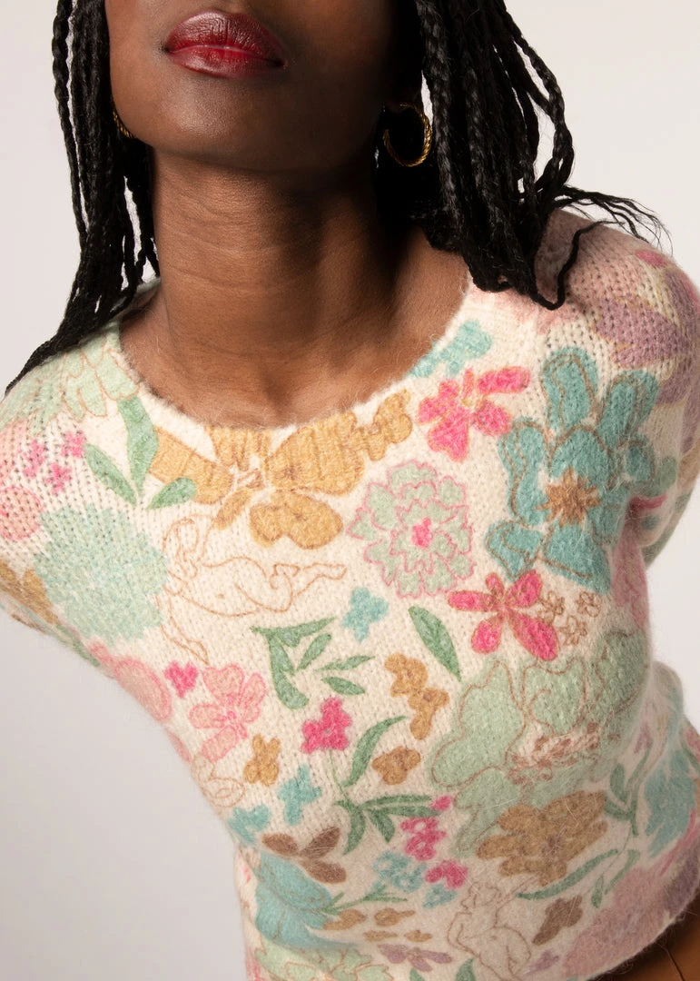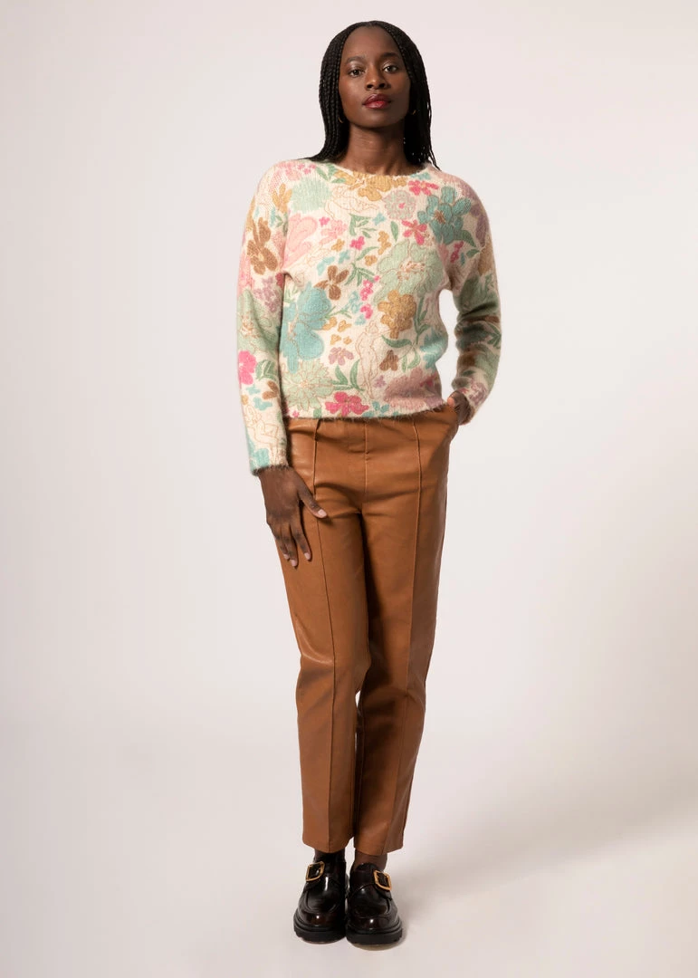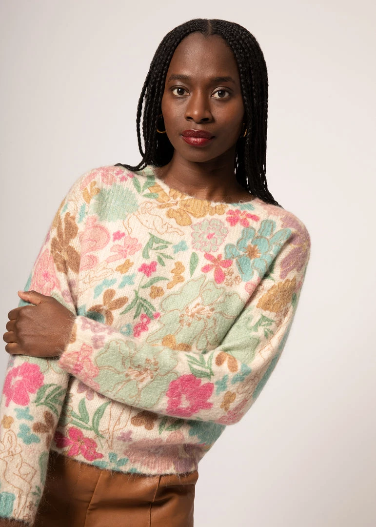 The hand knit Nérine is designed with the exclusive FRNCH print, It features subtle silhouettes with flowers, a round neck and a straight cut that combines comfort and originality. It is made in Italy and has an ultra-soft feel thanks to its mohair composition. A sweater that will easily brighten up your seasonal wardrobe.