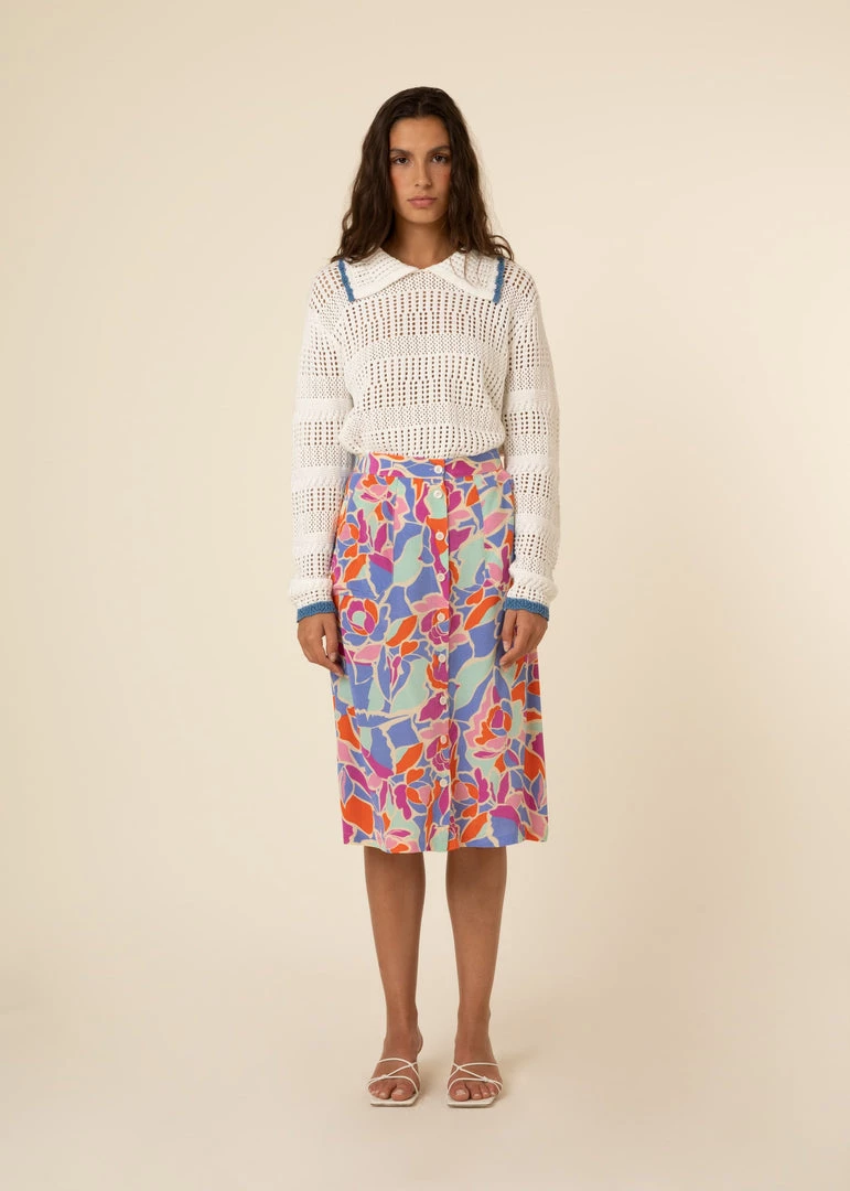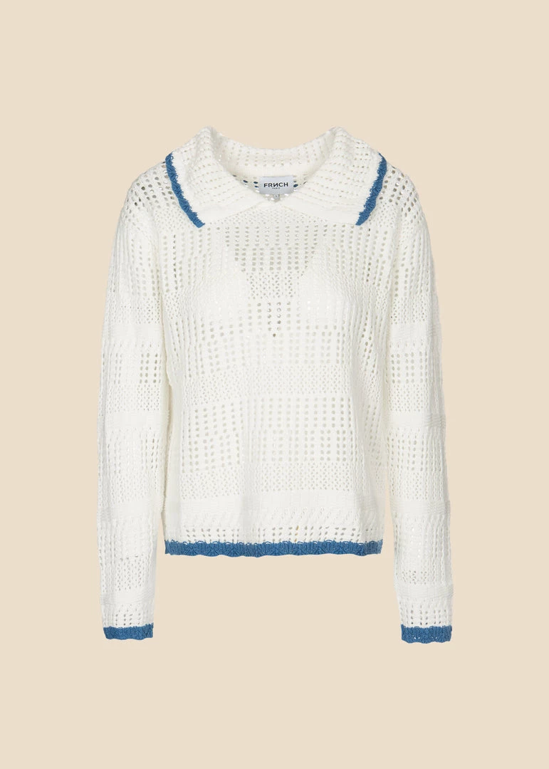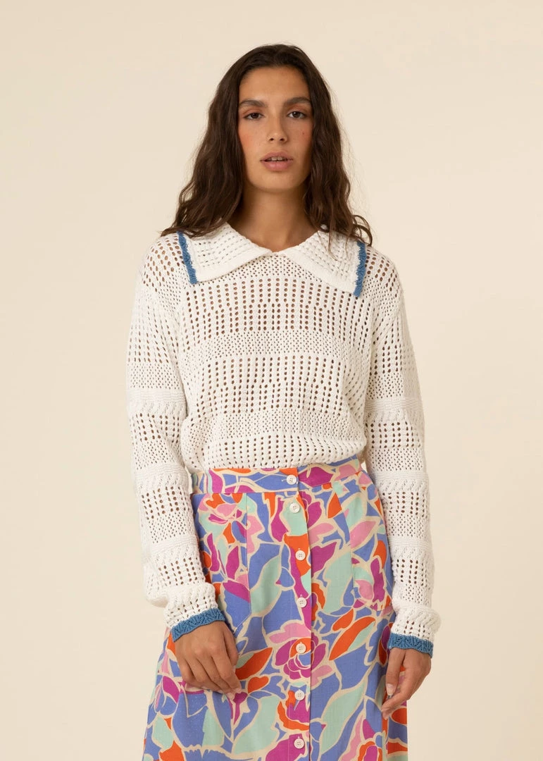 The Mika crocheted top has been given plenty of extra details. That means an all-over textured stitch pattern for an intricate effect, combined with elegant blue trim around the Claudine collar, cuffs and hem. Knitted from pure combed cotton, this style is soft and naturally breathable. The semi-fitted shape is flattering and feels all-day comfortable, too.