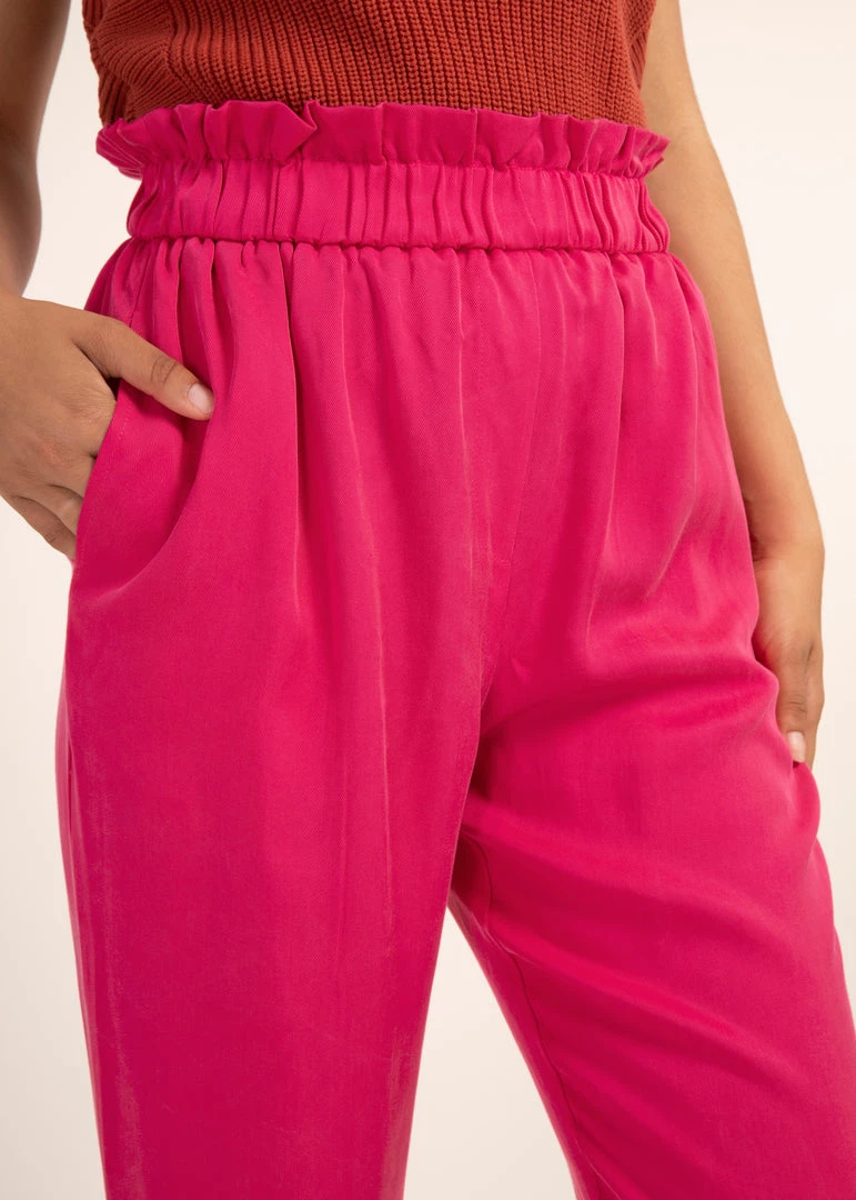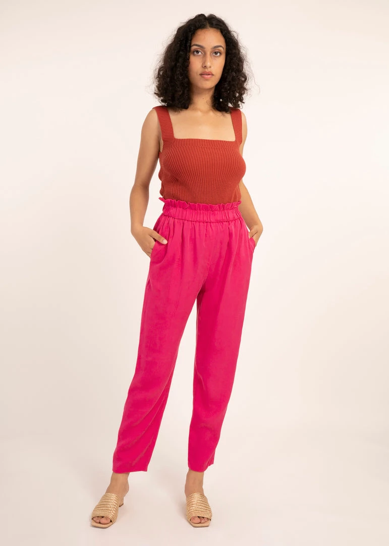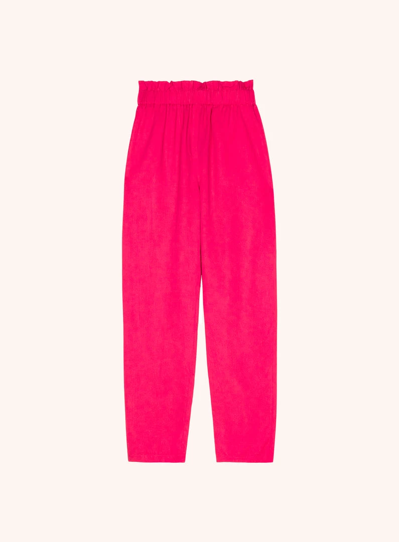 Fall for the cool casual look of the Phanelie pants. An beautiful piece thanks to the gathers on the waistband, its elastic waist brings comfort and femininity to its slim cut. Fluid and elegant, they are a must-have for any wardrobe, as they can dressed up or down.