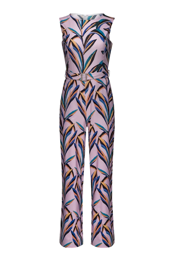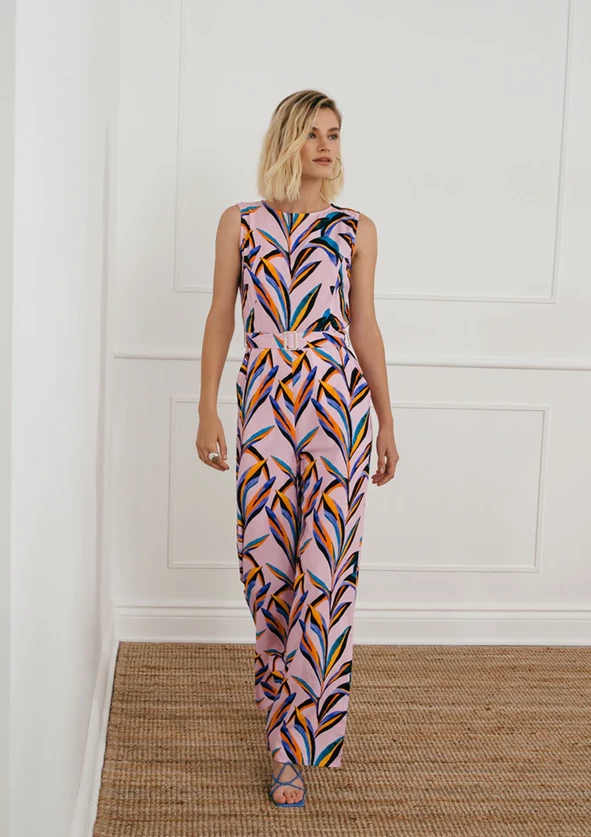Be the life of the party in this versatile wide leg jumpsuit featuring this beautiful Spring print of abstract palm leaves. This is a high neck jumpsuit made from lightweight Viscose fabric that looks great with a denim jacket or a knit thrown until the warm weather begins.