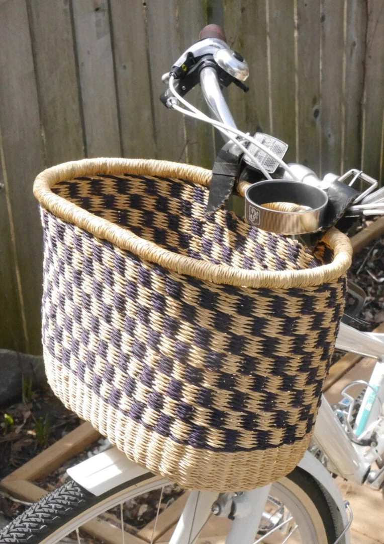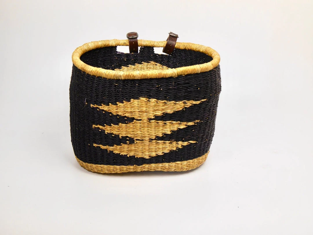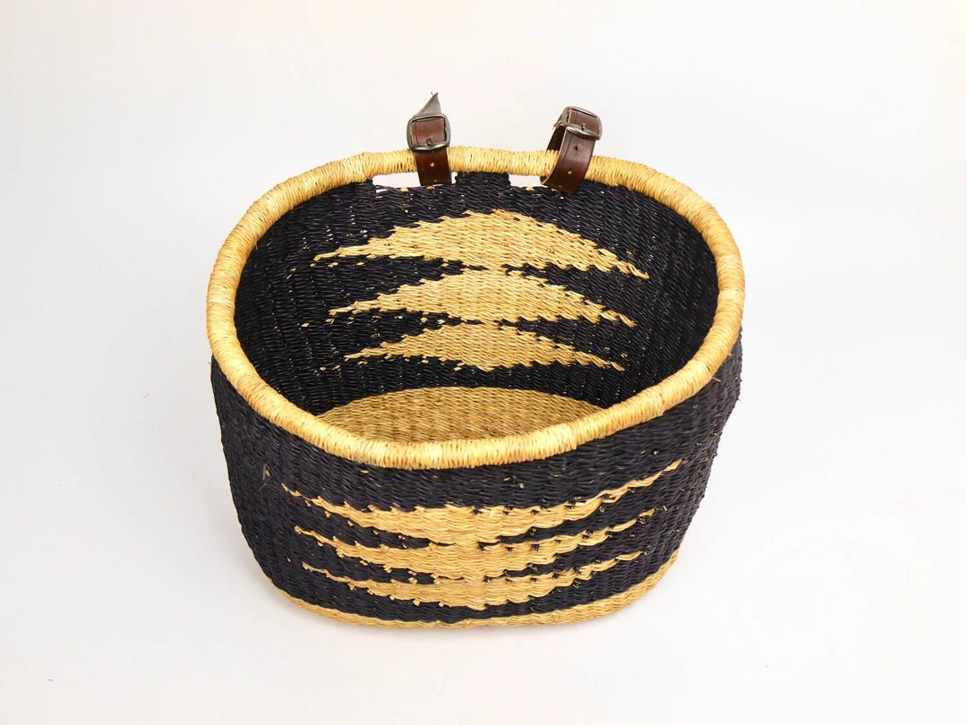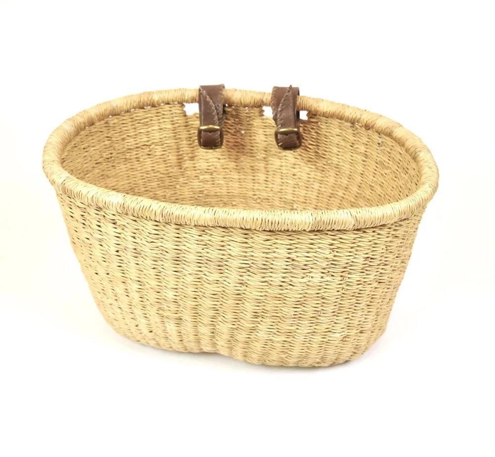 Beautiful and handy bicycle basket for transporting your goods in style. Metal bar inside the weaving keeps to basket in form. Mounts directly to the headset of your bicycle. Adjustable goat leather straps allow you to attach the basket to most bicycle models.
