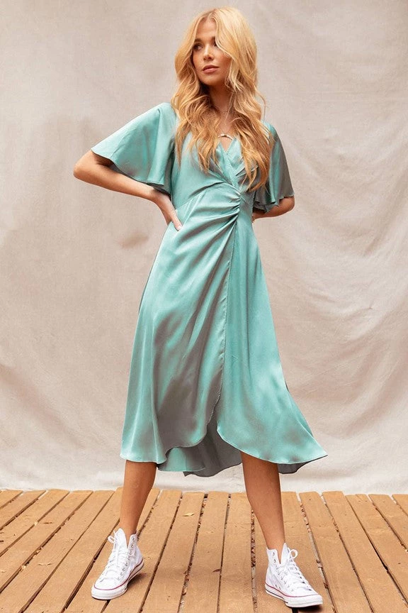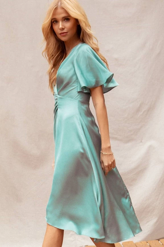 We’re saving this dress for the most special of occasions, thanks to the luxurious Charmeuse fabric, gorgeous twist front detail, bell sleeves and flattering A-line fit.