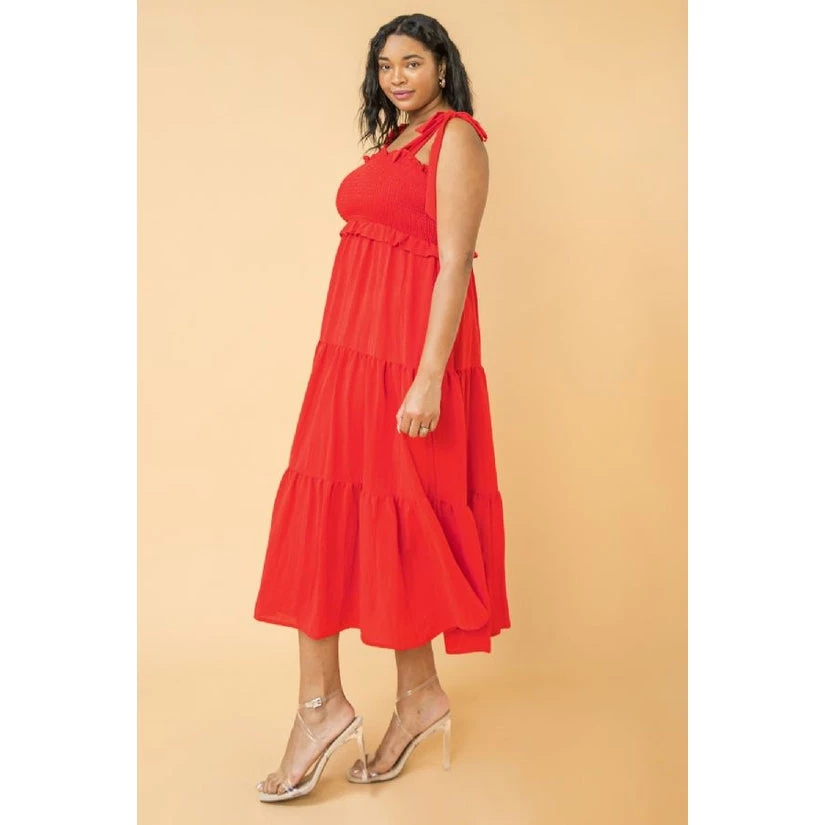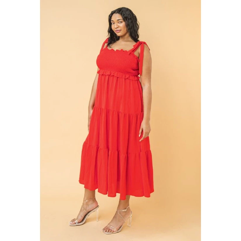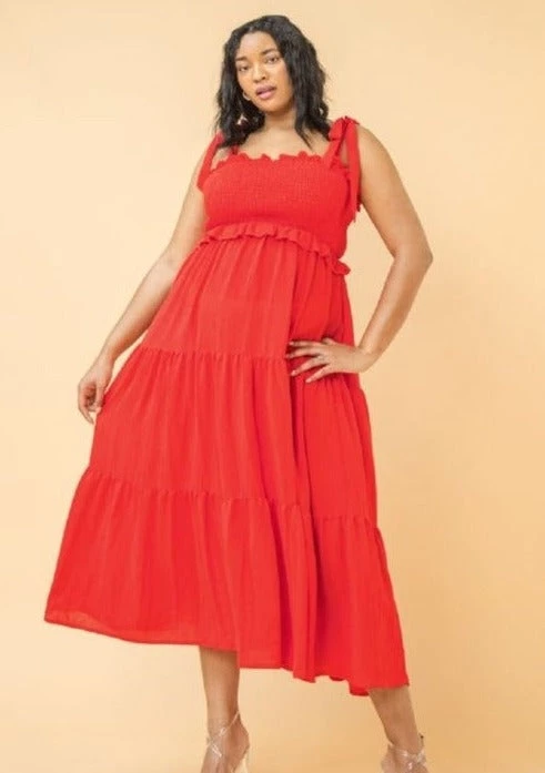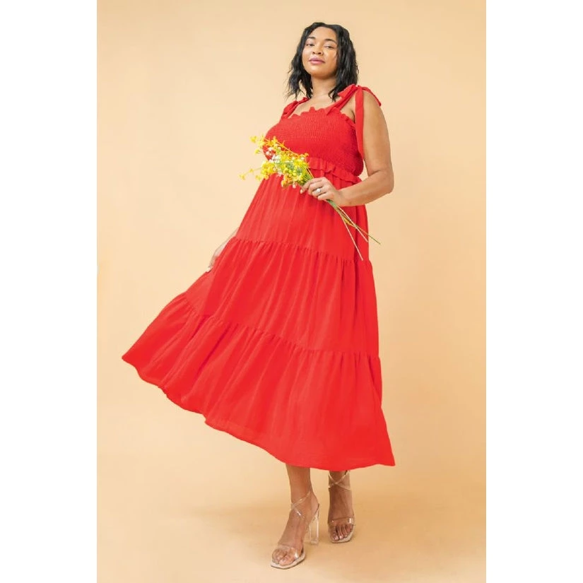 Three cheers for the three-tiered midi dress. Crafted from a cotton blend, this summer style is equal parts cool and comfortable, with a smocked bodice. The semi-fitted shape is easy to wear – shoulder ties and a ruffled front give it a downtime-ready feel. The flattering full skirt has been designed to fall from the waist and added soft gathers for an elegant finish.