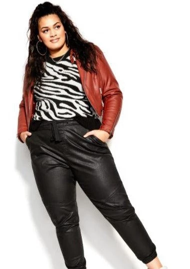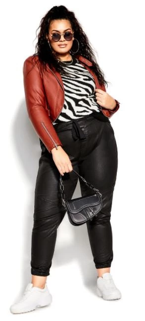 It’s official… Vegan leather is back. This style is crafted in faux leather, and it’s absolutely perfect to wear on low-key, lounge-y days (to the point that we’d even liken it to a closet staple). These cool joggers feature an easy fit through the leg with a gathered ankle. We love them even more with our Aria mock neck blouse, for a full-on amazing look.