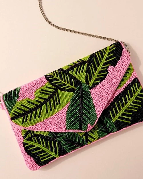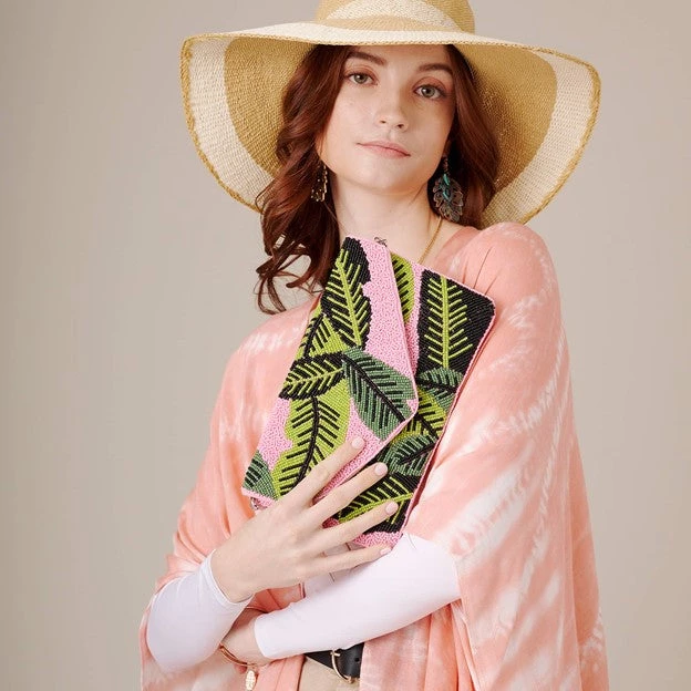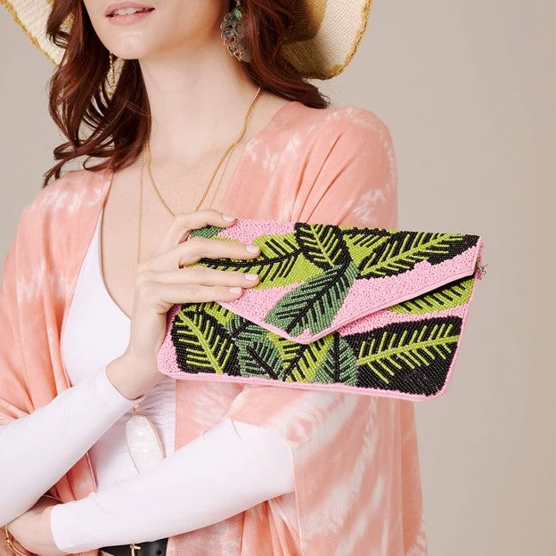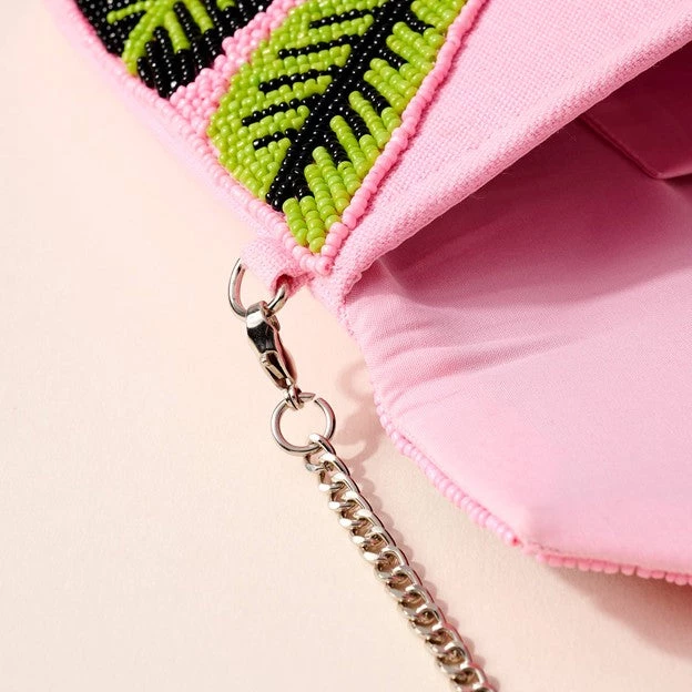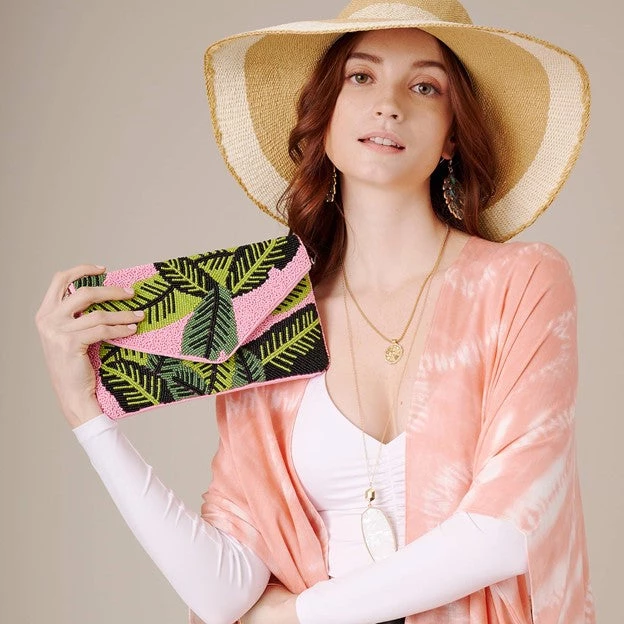 Introducing the handmade palm leaf beaded clutch, perfect for pairing with all your spring-ready outfits. With a fun pink lining, inner pocket, and a magnetic closure, all your on-the-go essentials stay organized and secure. Plus, the removeable shoulder strap ensures you can wear it multiple ways.