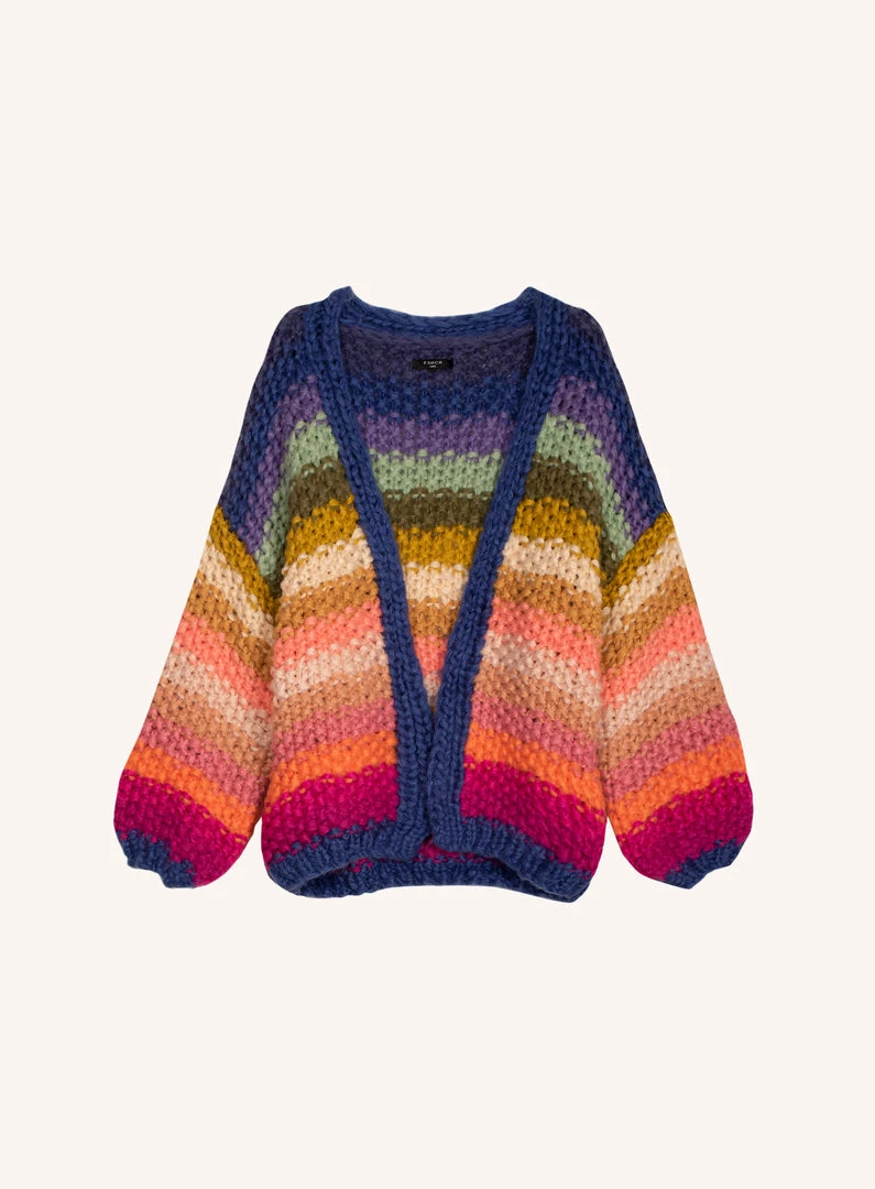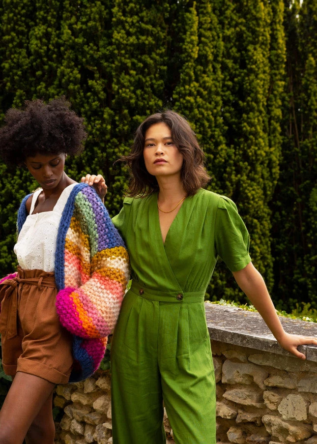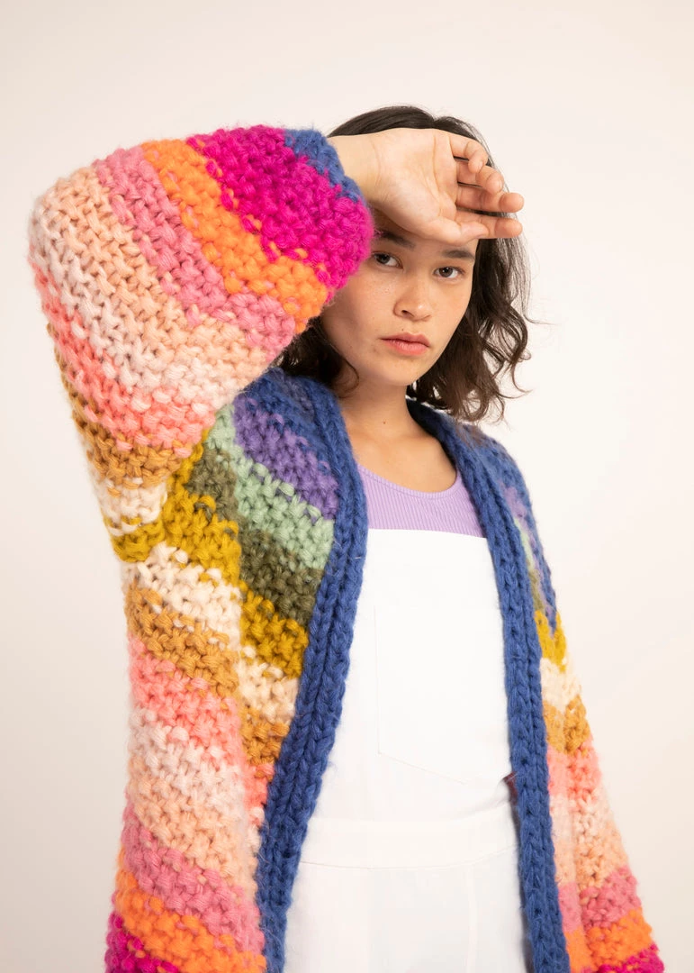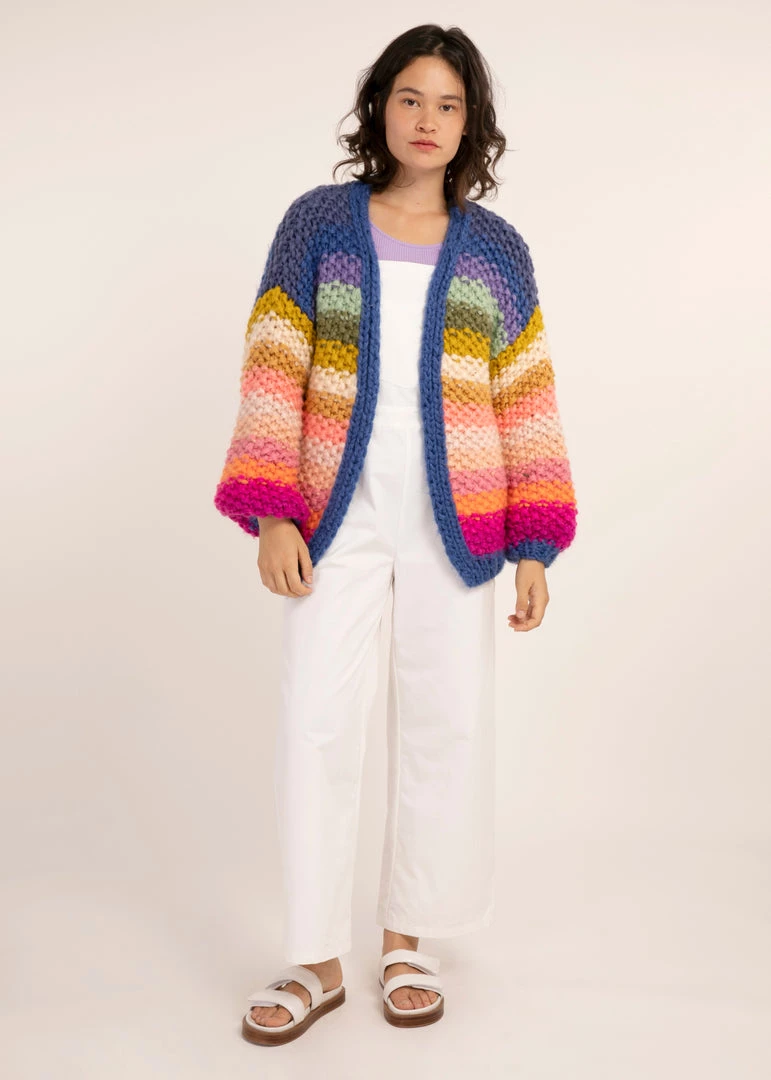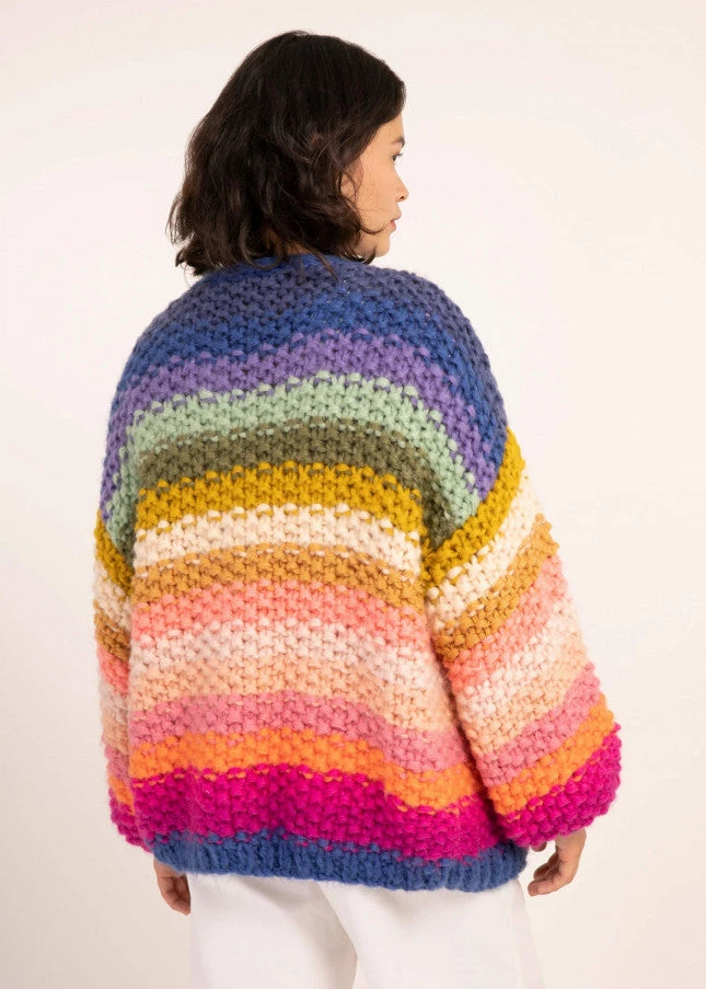 Lobélia is the knit that will warm up the cool summer evenings. Ultra-soft and airy, its oversized cut is enhanced with colorful stripes that brings a sweet cheerfulness. A comfortable piece, ideal for a feminine and casual look.
