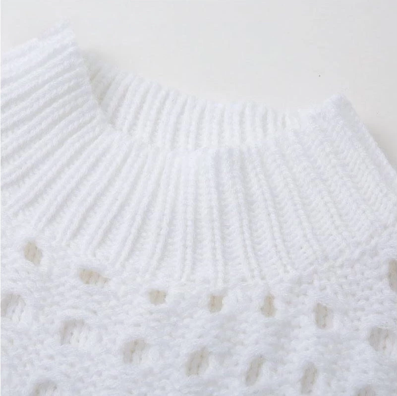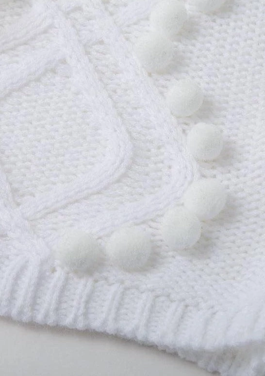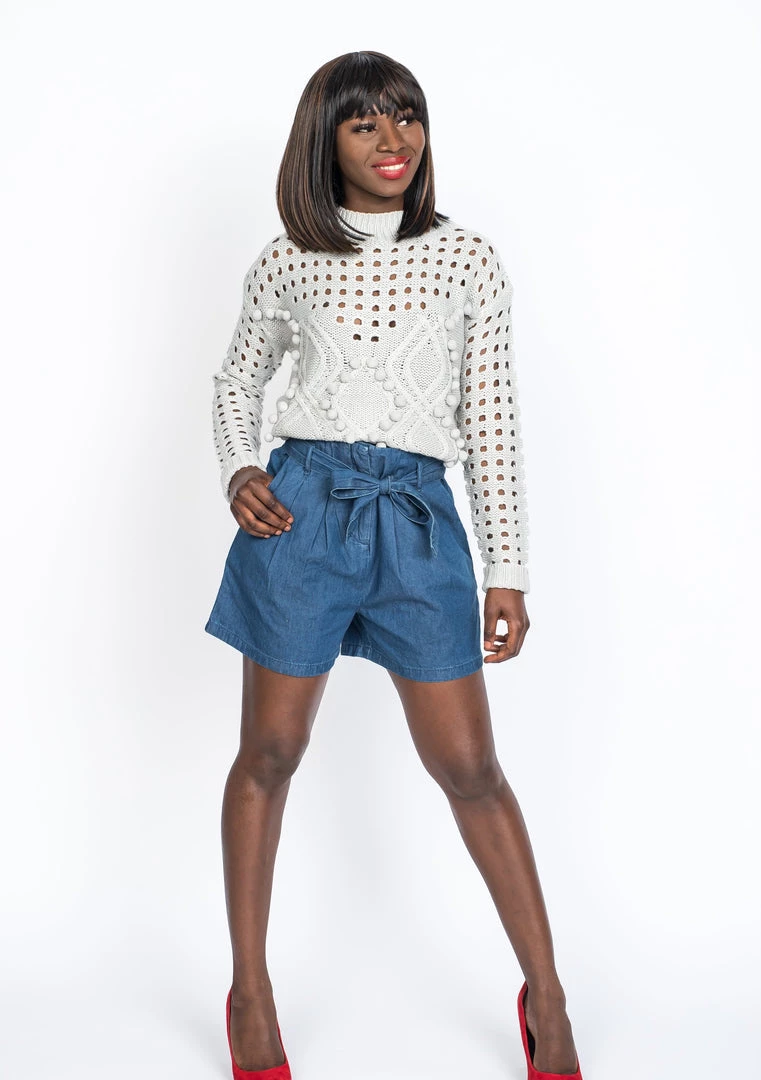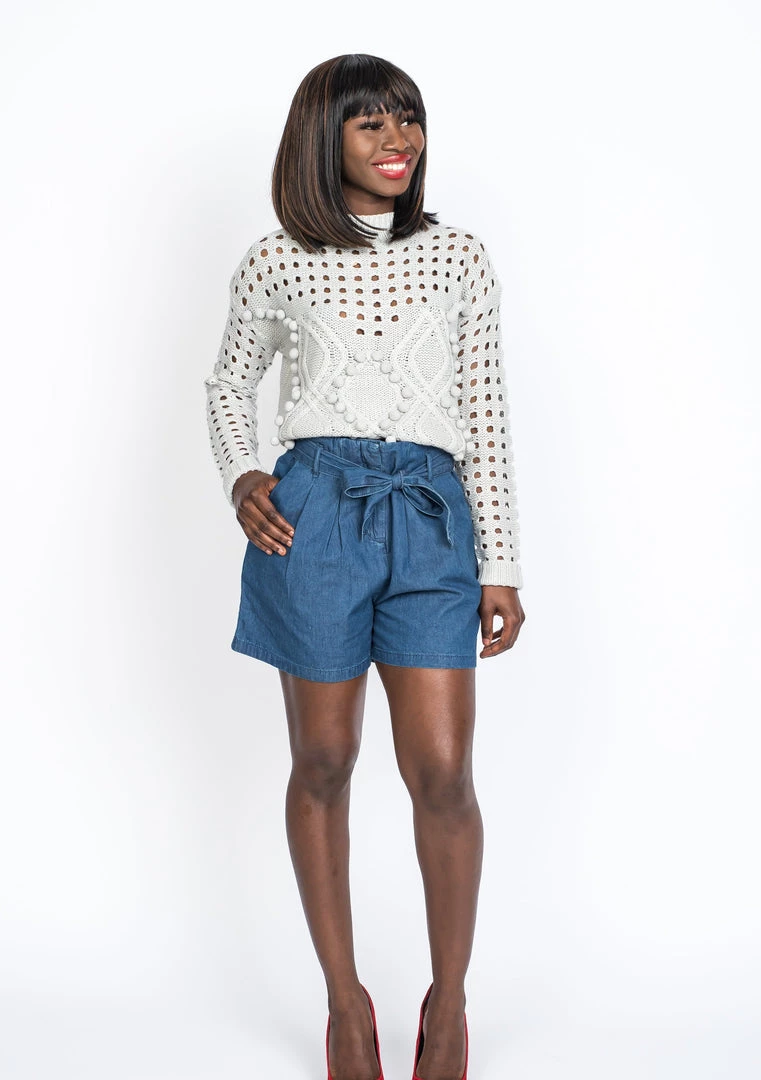 Three of our favorite details—Eyelet, cable knit and pom-poms—come together in this unique textured cropped gray sweater. Even better, it’s made from a cozy-yet-lightweight material in a cool, mock-neck silhouette we love.
