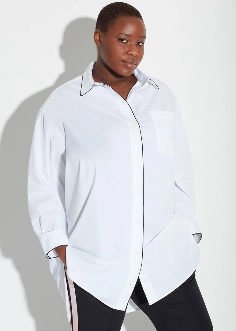 An icon beyond seasons, The Essential Tunic Shirt will be a favorite in your closet for years to come. Crafted with movement, comfort and style in mind this elegant silhouette has cooling and wicking features for body-heat regulation and a deep-back pleat for easy arm mobility. A slightly dropped shoulder gives a relaxed fit, and an elongated tunic length delivers versatility as either a shirt or dress. Refined piping details at collar, cuff and center front placket underline distinctive See ROSE Go signature details. And (spoiler alert!) there is a joyful discovery built into the side seams that will have you exclaiming…POCKETS! Tailored for both the boardroom and brunch, style yours effortlessly with a pair of leggings or wide leg trousers. Costumers describes this Tunic as “Amazing dress for an oversize fit” Plus Size Extended Sizing Inclusive Sizing