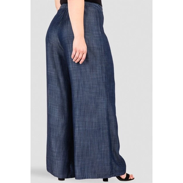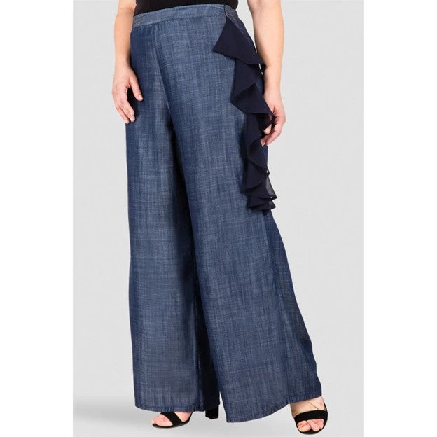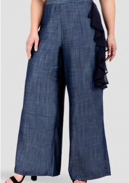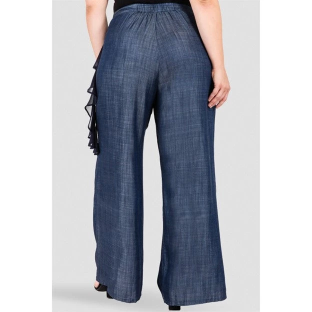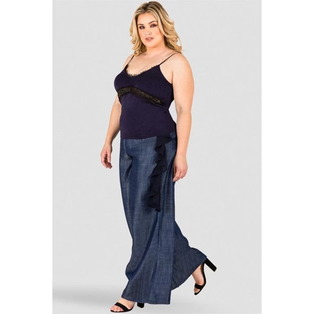 These Tencel palazzo pants feature a show stopping side flounce. While the ruffle adds just the right amount of statement, these dark indigo trousers are a true classic and will stand the test of time. The Tencel fabric is flowy and moves elegantly when you walk. Never heavy or stiff.