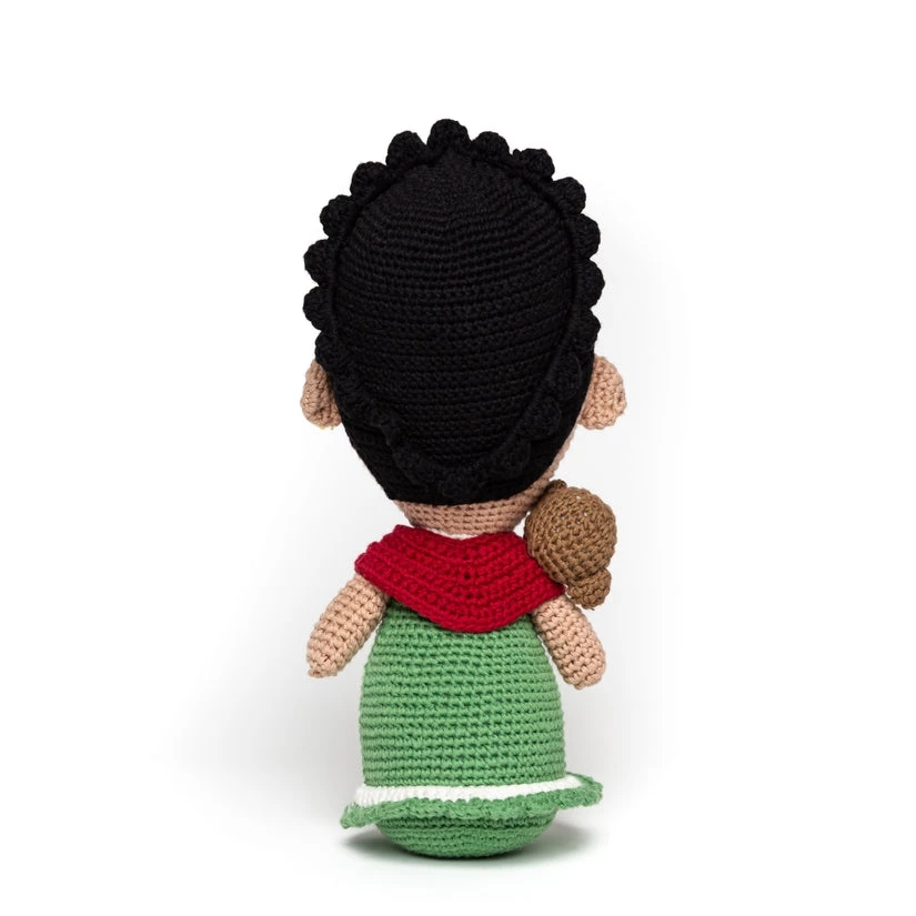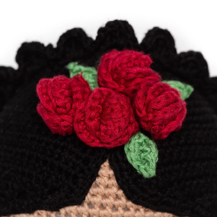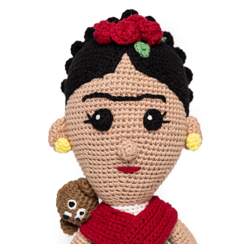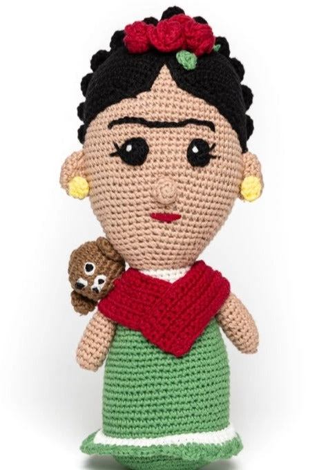 This adorable Frida Kahlo crochet doll will be your new best friend! This soft, playful doll features Frida’s famous unibrow, flower headband, and monkey.